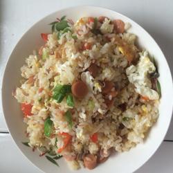 2. Add the rice and stir-fry.After the rice is stir-fried, add the green and red peppers and ham cubes