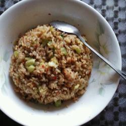 3. When the oil is hot, stir-fry the cabbage and cucumber for a few times and then add the leftover rice.Stir-fry (remember: you have to break the leftover rice into small pieces).Beat the eggs and stir-fry.Add salt, soy sauce, chili powder.Stir-fry.Add green onions