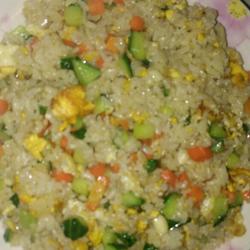 4.Add carrots and cucumber cubes, continue to stir-fry and then pour in rice