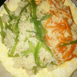 3.Then pour the carrot fried rice on top of the fried eggs