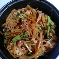 1. First cook the rice, then blanch the broccoli, cut the meat into shreds, cut the potatoes into shreds, and sauté the oil in the pot until fragrant Onion, ginger and garlic, add the shredded pork and stir-fry, then add shredded potatoes, two tablespoons of Laoganma, add in the flavor,