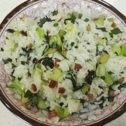 2. Add a little oil and fry bacon, green cabbage and green cabbage leaves in sequence