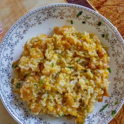 4. The pumpkin is cooked (I forgot to take a photo here.When stewing pumpkin, you need to add salt.) After the pumpkin is cooked, add rice, dried radish, onion, garlic, and appropriate amount of soy sauce, stir-fry evenly