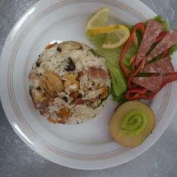 2. Increase the temperature of the iron plate to 300℃ and add a little oil.When the oil smokes, stir-fry the mushrooms, bacon, tofu and tofu until medium cooked.Add the clams and then add Stir-fry with a little oyster sauce, add a little salt and black pepper, add rice and stir-fry until cooked, add coriander and chives