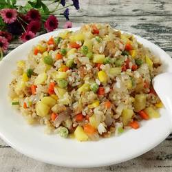 7. After the rice is cooked, add the fried minced meat and pineapple, and continue to stir-fry until Spread the ingredients evenly into the rice and serve.