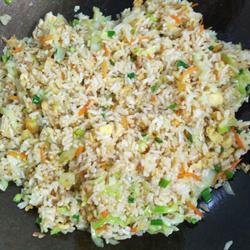 8. Then pour in the white rice, add a tablespoon of soy sauce, and stir-fry until hot and even , then add green onions and stir-fry for a few times, then it’s ready.