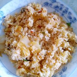 3.Put an appropriate amount of oil into the pot.After the oil is hot, add the chopped green onion and fry the spicy cabbage for a few times.Add the rice..