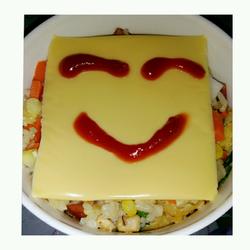 5.When it is almost cooked, you can put it on a plate.Place a slice of cheese on top of the rice and heat it in the microwave for 1 to 2 minutes until the cheese melts...(Add the tomato sauce when it is ready to eat) p>