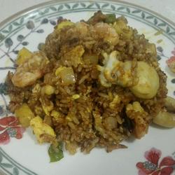 2.First scramble the eggs until they are half-cooked.Then stir-fry the cuttlefish and shrimp until cooked through.Stir-fry the onions over low heat, add the Thai Royal Sauce and green peppers and stir-fry, add the leftover rice, mash and mix well.