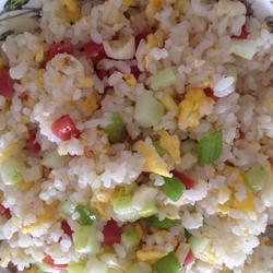 2.Put oil into the pot.When the oil is hot, knock the eggs into the pot and stir-fry.Add the carrots.Stir-fry the ham sausage and green pepper, then add the rice and stir-fry for a while, then add the cucumber and chopped green onion into the pot and stir-fry, add an appropriate amount of salt and stir-fry