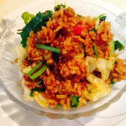 1. Heat oil and stir-fry eggs , add chopped green onion and stir-fry until fragrant, add rice, a small amount of soy sauce, chopped pepper, stir-fry evenly, add cabbage and stir-fry for a while