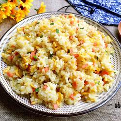 7. Add eggs, ham sausage and curry and stir-fry evenly.