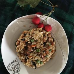 4.Put oil in the pot and heat it up Sauté onions and carrots, add soy sauce, peas, diced ham and fungus and stir-fry evenly