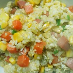 11.Pour in ham sausage, carrots and corn kernels and stir-fry evenly, add chopped green onion and bring to the pot