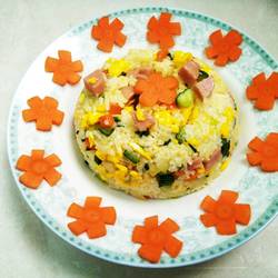 6.Pour in diced carrots and cucumbers, Stir-fried diced pork sausage