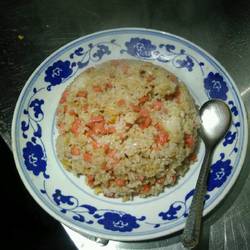 4.Put oil in the pan, sauté onion and garlic, add cumin, then add rice and stir-fry, add ham sausage, salt, chicken essence, MSG, oyster sauce, white pepper, stir-fry twice and take it out