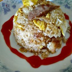 2.Put it into the pot and stir-fry, add the sausage and then add the rice.