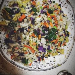 4. Saute the diced vegetables until fragrant, add the fried eggs, season, and add rice.Change to low heat, stir-fry until fragrant, and take out the pan!