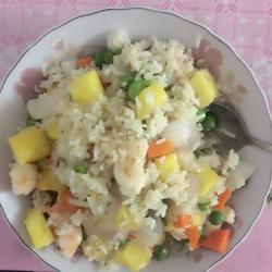 2.Waiting Stir-fry the prawns until they change color.Add pineapple, ham sausage and rice and stir-fry together