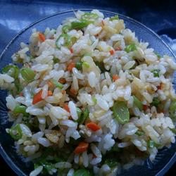 2.Put oil in the pot, appropriate amount of salt, add the onions first until fragrant, add the green beans and carrots, Stir fry until the rice is almost cooked