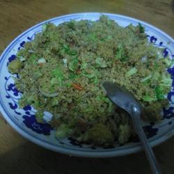3.Put oil in the pan, heat up the green onions and sauté until fragrant.Add the above vegetables and fry until cooked.Add the millet, lower the heat to low, add various seasonings, stir-fry, put on a plate and serve out