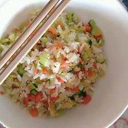 4. When the eggs are almost fried in the pot, add diced cucumbers and carrots.Stir-fry until the vegetables change color, then add the leftover rice, stir-fry, add a little salt as appropriate, and wait until it is out of the pan