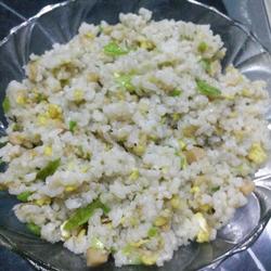 1.A bowl of cooked rice, diced green pepper and ham, beaten eggs with salt, and chopped green onion.