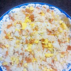 Rice---eggs--ham sausage (A bowl---one--one ) | Oil---chopped green onion---edible salt---MSG (appropriate amount of each ) |