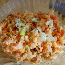 5. Remove the rice, put oil in the pot, chopped green onion, add tomatoes, add appropriate amount of tomato sauce