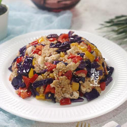 6.Add carrots and stir-fry for a while, then add purple cabbage and stir-fry until almost cooked;
