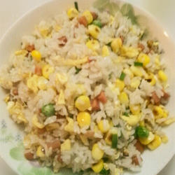 10.Use the remaining oil from the ham, pour in the rice, stir-fry until the grains are loose, add the green beans and corn, stir-fry for one minute, then add the fried egg and ham and stir-fry.Add chicken essence, salt and stir-fry quickly, sprinkle with chopped green onions, add vinegar, stir and serve.