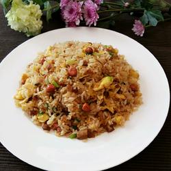 1. Dice the sausage , cut green onions, break eggs into a bowl, peanuts, rice is ready for later use
