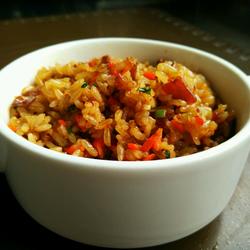 17.A bowl of fragrant meat sauce fried rice is ready.
