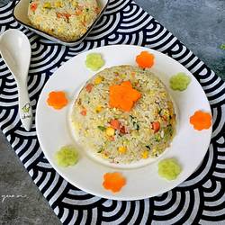5.Fry the eggs until cooked, then stir-fry evenly with the rice6.Add corn kernels, diced cucumbers, and diced carrots and stir-fry evenly