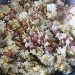 4. After the oil pan is 70 to 80% hot, add the mixed Sichuan peppercorns.When the aroma comes out, add the ham sausage and stir-fry until the ham sausage becomes fragrant and changes color.Add the egg liquid and stir-fry, then add the rice, then add a little salt, stir-fry over high heat, then turn to medium heat and continue.