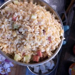 2. Prepare the remaining rice and break it into small pieces.Add eggs and diced ham