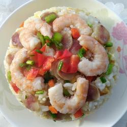 7. Pour in green and red bell peppers, Cantonese sausage, chopped shrimp and rice After frying evenly, turn off the heat.