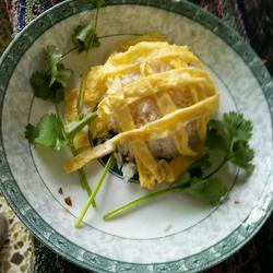5. After the rice is fried, place it in a bowl and pour it into a basin.Decorate with cut egg strips.Add cilantro to the basin to garnish.