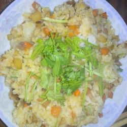 5. Pour in the rice ~ reduce to low heat and stir-fry ~ if you feel the flavor is not enough, you can add more A small amount of salt ~ sprinkle with coriander and serve