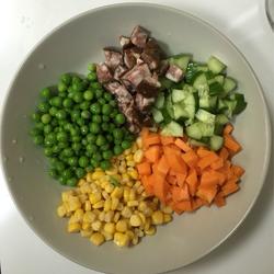 3. Add oil and fry carrots first, then add diced sausage, diced cucumber, and diced corn in sequence.Add a little salt, fry until about half cooked, take out and set aside.Fry the cooled rice, add a little oil and salt, then add oil and beat in the eggs.When the eggs are slightly formed, stir-fry them with the rice.Then add the fried auxiliary vegetables and stir-fry, add soy sauce, a little chicken essence, stir-fry for 1-2 minutes and it is ready to serve