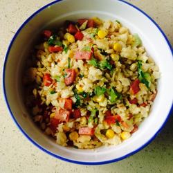 4. Fry the rice until the grains are separated, and then pour in the ham and corn kernels., shredded lettuce, continue to stir-fry for a while.Finally, add the minced green onions, and serve when the aroma of green onions hits your face.