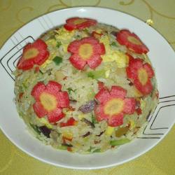 6. After the pot is out of the pot, put it into a bowl and compact it.Invert it and put it on the plate.Paste the radish flowers, and then The beautiful and delicious curry fried rice is ready.
