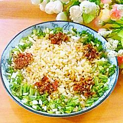 9.Put the rice on a plate, sprinkle green onion around it, and garnish with chili sauce