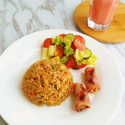 3. Pour in the prepared sauce and continue to stir-fry over high heat until the rice is completely absorbed.Once it's all absorbed, you can serve it out.