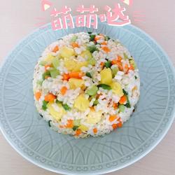 4. Add oil and heat the pan, first add the diced carrots and stir-fry until fragrant, then add the diced green peppers and stir-fry, then add the rice (use a spatula to flatten the rice grains) Spread to taste), finally add cucumber and pineapple cubes in turn and stir-fry, stir vigorously over high heat! Fill the entire bowl, tip it onto a plate, and you’re done!