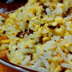 4. After the side dishes are half-cooked, pour in the rice soaked in egg liquid and stir-fry until the rice is scattered into pieces.It will stick together and it is ready to serve