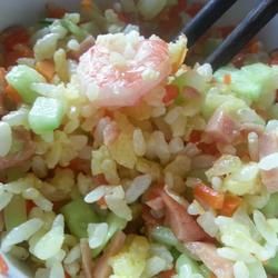 10. Pour a small amount of oil into the pot, heat the oil, pour in the remaining rice mixed with the egg liquid, stir-fry, add diced carrots, ham, cucumbers, shrimps, minced green onions, and remove from the pot..