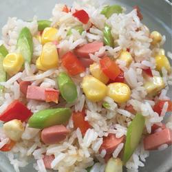 1. Prepare ingredients: asparagus, red pepper, ham, corn, rice.