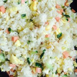 6. Fry the rice until the grains are separated and pour in the fried eggs, cucumber and ham dices