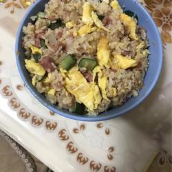 4.After sauteing, add diced cucumber and diced ham and stir-fry over high heat for one minute